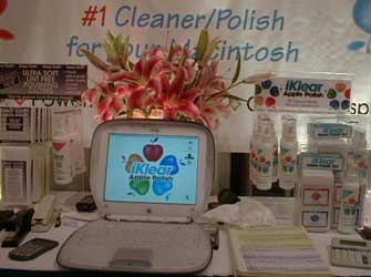 Of course, I'm not suggesting that you work on your PowerBook while you're driving; that won't quite increase your productivity. But this adapter can certainly be a productivity boost if you rideshare or spend time waiting to pick up friends, associates, or kids. They are also coming out with an adapter that you can use on an airplane (if you happen to be traveling first class). A nice little feature: I was able to know the car's outlet didn't work because the adapter has a small indicator light. Checking it out in my own car later, I verified that the adapter works beautifully. It's also so small that it fits in the cell phone pocket of my PowerBook case. VST also makes a car adapter and other power adapters. Although I don't have first-hand experience with theirs, I have long known and trusted VST products, such as their battery chargers. For a Shiny and Clean New Year I start each new year by visiting one of my favorite booths for an old favorite product I am never without. For years I've been hooked on iKlear Apple Polish (also known as Klear Screen). This is THE product for cleaning your monitor or PowerBook screen, no matter what brand or type of monitor. In fact, Apple officially recommends it for their Cinema and Studio displays and sells it in their on-campus store. iKlear is also the clear choice (again recommended by companies such as Apple) for cleaning all models of Macs and plastic-cased peripherals. Ammonia and alcohol dry out plastic so many traditional cleaning products cause your iMac, iBook, PowerBook, Palm, and other computer and equipment cases to dry out become dull, and crack. Apple has even already recommended it for the new Titanium PowerBook. Again, I use it on all cases of all the above-mentioned equipment. But hold on... there's still more.... If your have one of the recent PowerBooks you can use iKlear to remove the key marks from your screen (by wiping hard), then place one of the iKlear polishing clothes over the keys when you Shut Down and close your case. I actually found out about how well it removes key marks when two women told me an Apple employee told them. The idea to use the cloth as a key cover comes from users who reported that they've been doing this. The 5oz bottle, approximately 750 applications, sells for about $15. I recommend using their soft polishing cloths, about a dollar a cloth, along with iKlear. Or, you can get individual use packets, also shown here. For a Bright New Year