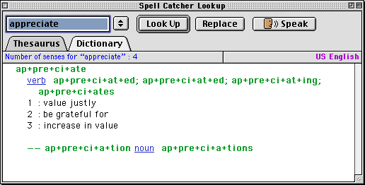 The Dictionary and ThesaurusOne of Spell Catcher's many values is that it can help you find the right word for your message. Just type a word you're considering, the select the word and choose Lookup from the Spell Catcher menu. In one neat window you'll be presented with a Dictionary tab and a Thesaurus tab. In the Dictionary tab you'll see the definition and learn more about the word, as shown here as I look up "appreciate."