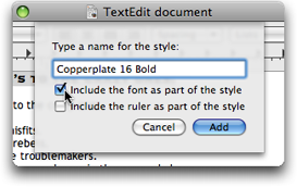 By using a Style you can quickly apply a look to your text characters or even apply paragraph formatting. Rather than open the Fonts panel over and over, applying each format again and again, you can set up a single look — such as a color, or a collection of looks, such as red, bold, italic, and double underlined — then apply the entire look with one click-drag-release move.